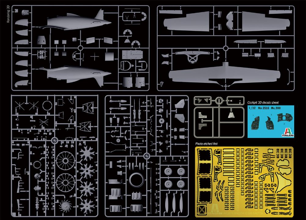 エンジンカウルからつながる機体形状もコクピット部分が盛り上がった特徴あるスタイルを形状はもちろんパネルラインなども正確に再現。加えて、仕上がりをシャープに演出するエッチングパーツも用意。オープンタイプのコクピットの再現も見逃せません。また、キャノピーフレームとホイルの塗装に便利なマスキングシート付属。機体のマーキングはイタリア空軍の6種を用意。飛行機モデラーにはじっくりと取り組んでいただきたい注目キットです。