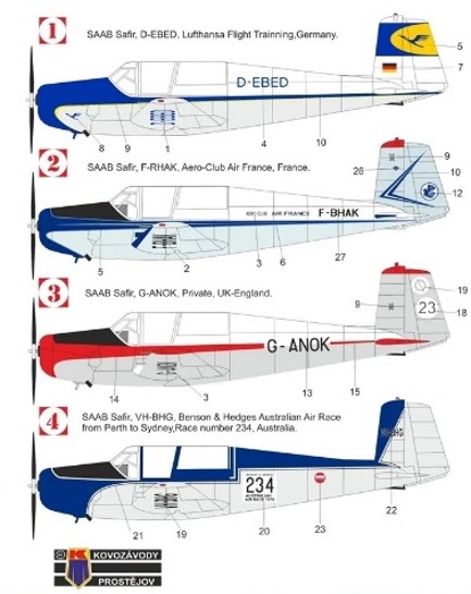 チェコのKPモデルから、完全新金型1/72 サーブサフィール インジェクションプラスチックキットのご案内です。サフィールは1945年に初飛行した、スウェーデンのスベンスカ航空機株式会社(Svenska Aeroplan AB、SAAB)で製造された複座単発練習機で、サーブとオランダのデ・シェルデ社の2工場で合わせて323機が生産されました。北欧を中心として数多くの軍隊や民間航空会社に運用され高評価を得た本機の内の1機は、日本の防衛庁技術研究所が民間機として輸入された機体を購入し、主翼を新設計の高揚力のものに換装することでX1G STOL機(サーブ・サフィール91B改)として飛行試験を行いました。2種プロペラパーツと4種デカールが付属しています。