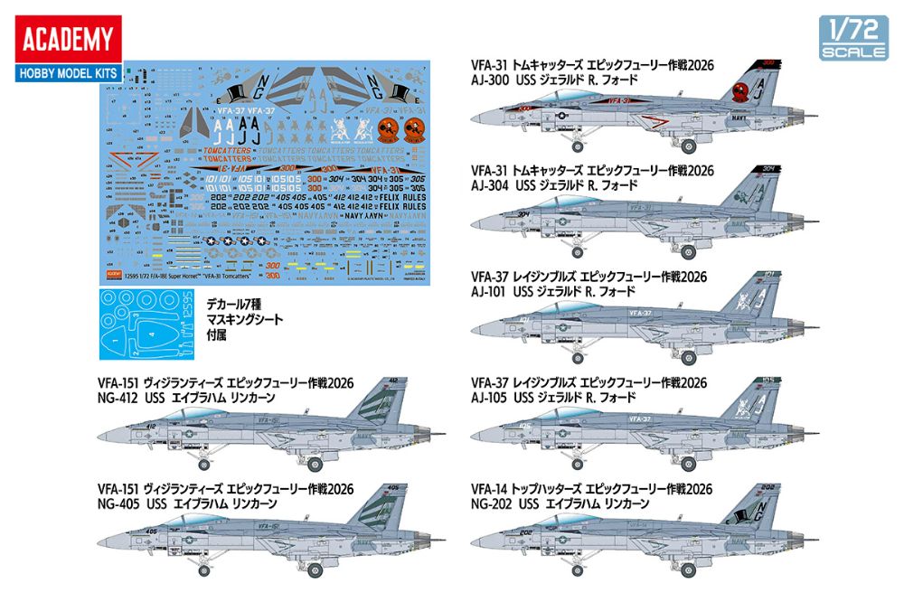 1/72 F/A-18E スーパーホーネット"VFA-31 トムキャッターズ"が登場します。製品はコックピットや着陸脚や機体のパネルラインと各種兵装を精密に表現しています。"エピック・フューリー作戦"に参加したVFA-31 トムキャッターズを含む新規デザインデカール7種類とキャノピーマスキングステッカーが付属しています。※本製品は輸入品のため発売時期が予告なく変更される場合がございますのでご了承ください。