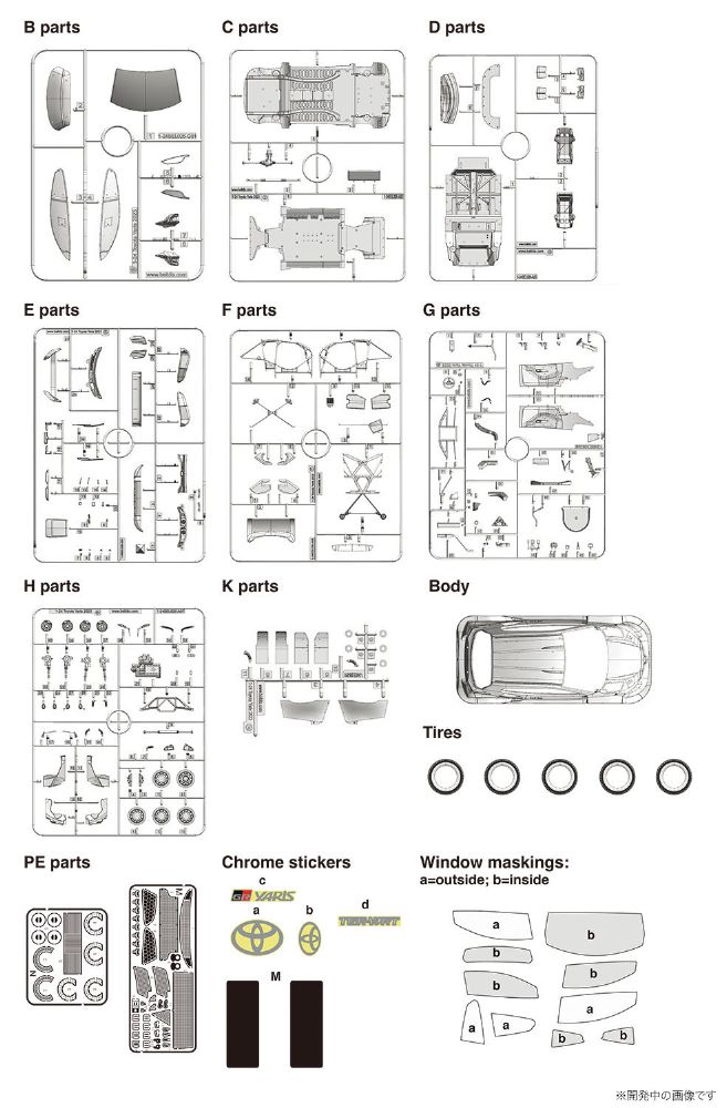日本のモータースポーツファンには見逃せないトヨタのラリーカー、GRヤリス ラリー1 ハイブリッドを再現した1/24スケールのプラスチックモデル組み立てキットです。仕上がりの全長は約176mmでGRヤリス ラリー1 ハイブリッドの2023年ラリー・メキシコ優勝車をモデル化しています。シャーシ下面はそのディテールはもちろんフロントにはエンジン下面のパーツも用意、加えて前後サスペンションもモデル化されメカニカルな仕上がり。サスペンションはラリー・メキシコのグラベル仕様をしっかりと再現。そして、コクピットはロールケージの形状、ディテールはもちろんABCペダルやステアリングコラム、ステアリングなどを詳細に再現。現代のラリーカーの詳細が注目です。ボディは大型のリアウイングやオーバーフェンダー形状など、迫力たっぷりにモデル化。ウインドウの窓枠塗装に便利なマスキングシートもセット。マーキングは優勝したオジェ選手のカーナンバー17に加えて、33、69、そして勝田選手の18も用意されています。